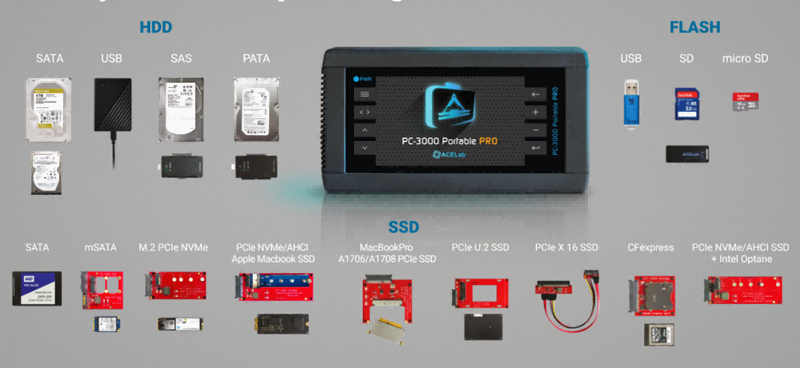 PC-3000 Portable PRO 是世界上唯一一款几乎可以从任何类型的存储设备中恢复数据的新一代工具:SATA/PATA/USB HDD、SAS HDD/